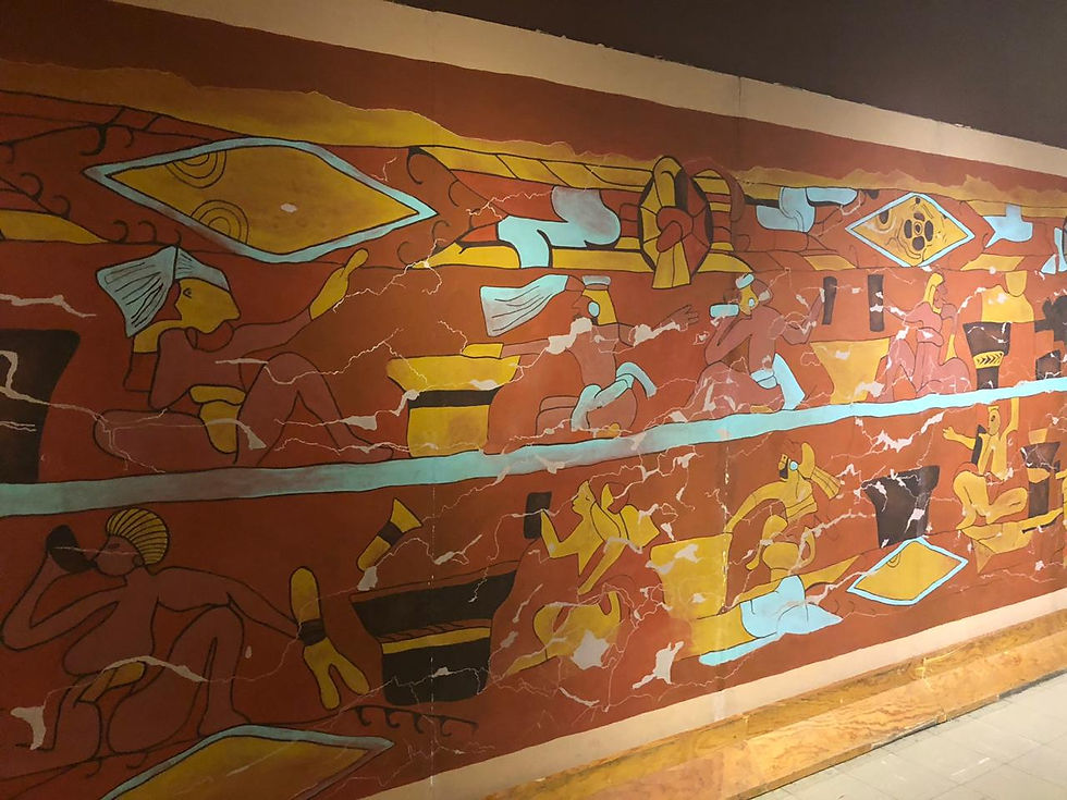 Es una de las obras pictóricas más grandes de Mesoamérica. Mide 56 m de largo por 2.5 m de altura. Además de ser el ornamento de la cara interior de un muro que delimitó el extremo poniente del Patio de los Altares. Muestra a 110 personas bebiendo pulque en lo que es una ceremonia o ritual dedicado a la deidad del pulque.
